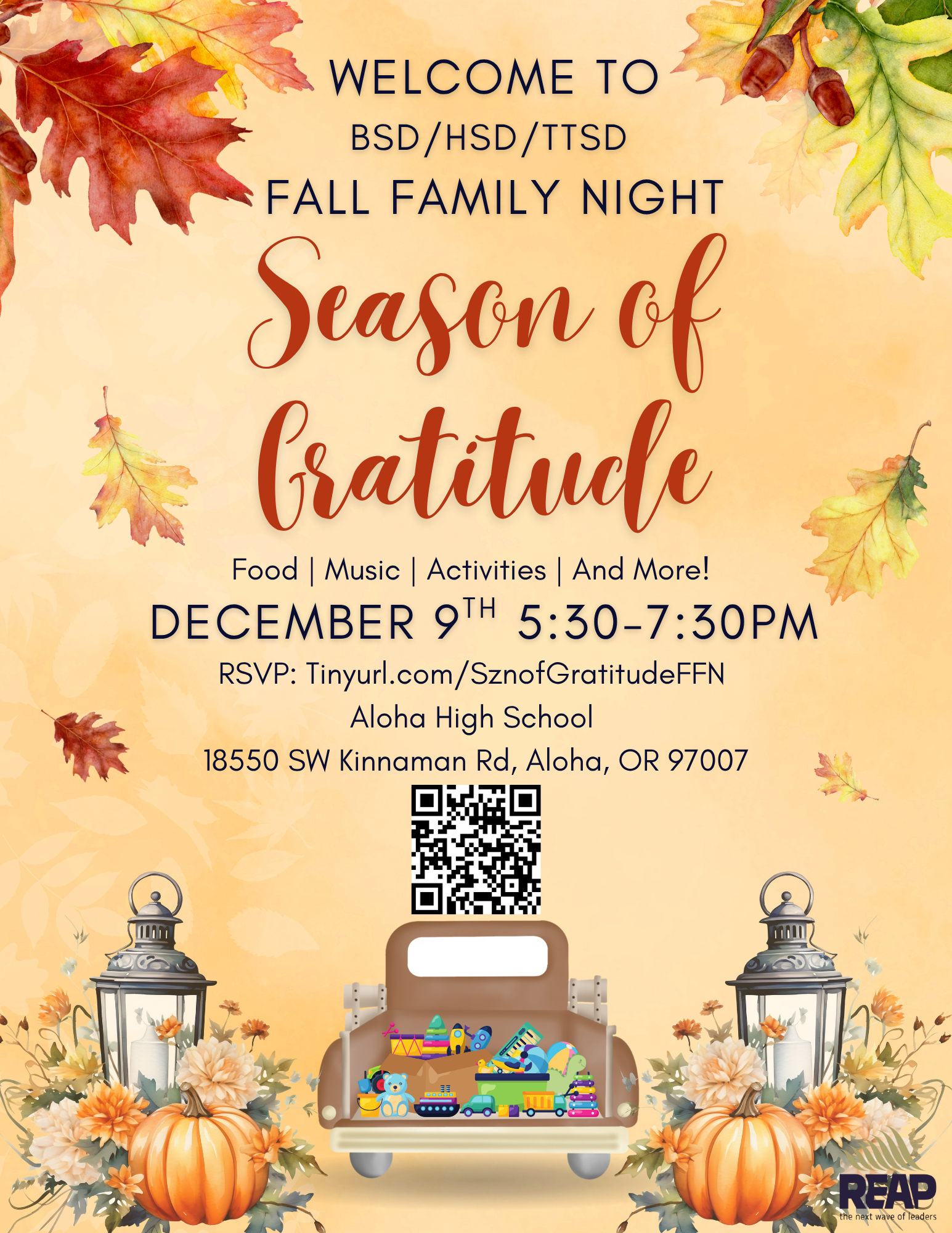 Join us for our Season of Gratitude: Fall Family Night event where returning and new students and families come together to learn more about REAP programs, future events, resources, and more!